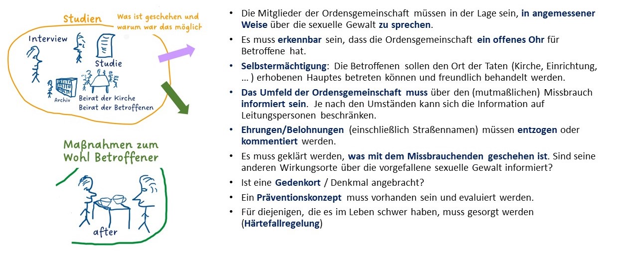 Braucht es noch mehr Studien? In vielen Studien sind die Wirkmechanismen für sexuelle Gewalt gut beschrieben. Es ist aber das Recht von Betroffenen, dass ihre spezifische Geschichte aufgeschrieben wird und diese auch so von der Ordensgemeinschaft, in deren Verantwortungsumfeld die sexuelle Gewalt passiert ist, so akzeptiert wird. Ohne diese Akzeptanz durch die Ordensgemeinschaft kann es keine Befriedung der Betroffenen geben. Daher ist eine Verschriftlichung geboten.