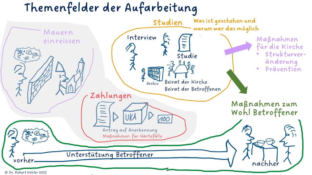 Wenn die Aufgaben dann später durch ein Aufarbeitungsteam, durch Studien und durch konkrete Maßnahmen begonnen oder weiterentwickelt sind, sitzen wir ihnen wieder gegenüber und klären was gelungen ist und was noch offen ist. Auch wollen wir Ideen vermitteln, wie noch bestehende Konflikte ausgeräumt werden können.