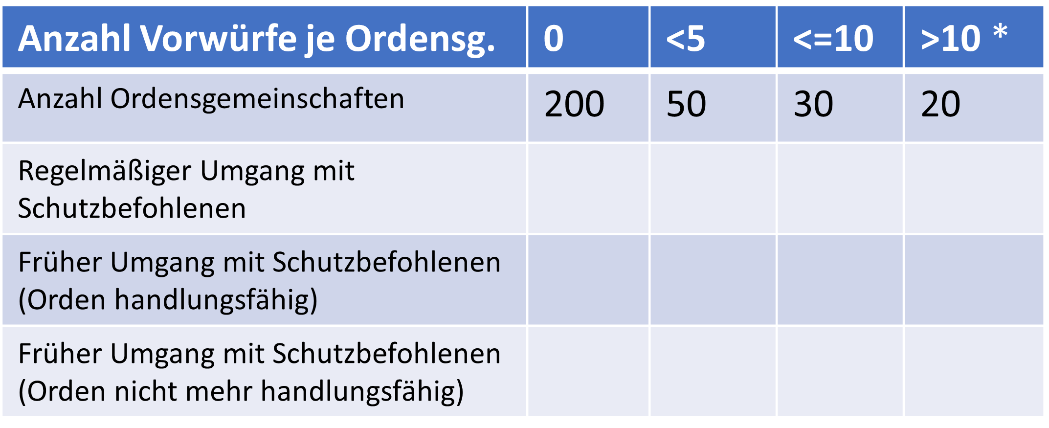 (* einige > 100)Die Vorgehensweise (Studie, Analyse, Bericht, Dokumentation... ) soll anpasst an die bekannte Anzahl der Beschuldigten (Hellfeld) und daran, ob die Ordensgemeinschaft noch aktiv mit Kindern arbeitet. Der Zeitabstand seit die Taten begangen wurden beeinflusst die Analysemöglichkeiten. Z.B. sind Zeitzeugen, die 1970 40 Jahre alt waren heute älter als 90. Der Zeitpunkt der letzten bekannten Taten (60er, 70er 80er ... 2000er) kann ein Indikator dafür sein, ob die Organisation heute noch die tatermöglichenden Elemente in ihren Strukturen hat und in wie weit ein organisationsbezogenes Lernen anhand der Strukturanalysen geboten ist.,
